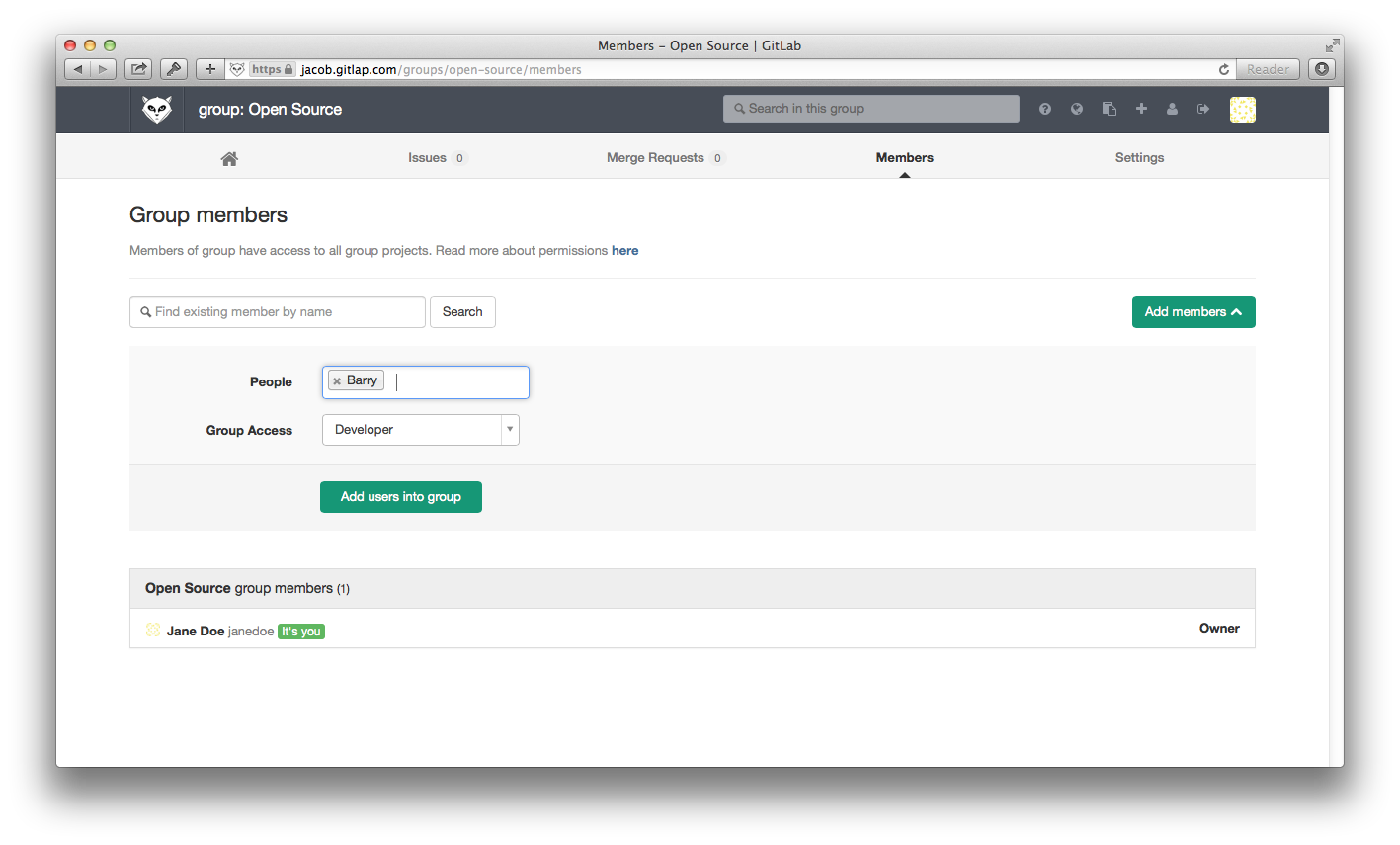 On the 'Group Members' page we can now add a new user Barry to the group.