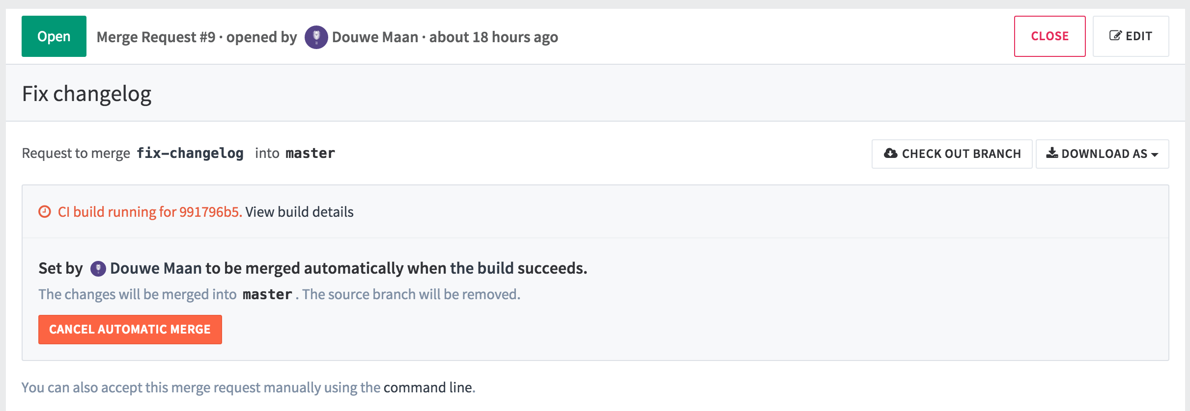 When reviewing a merge request that looks ready to merge but still has one or more CI builds running, you can set it to be merged automatically when all builds succeed. This way, you don't have to wait for the builds to finish and remember to merge the request manually.